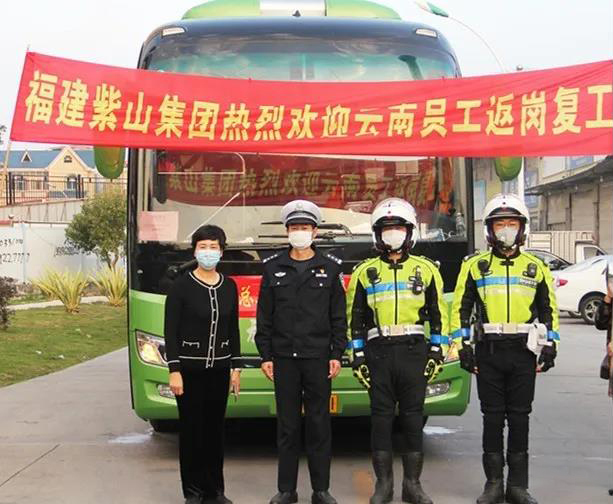 3月1日下午5點半,經(jīng)過56個小時、3600公里的奔波,2輛載著紫山近50名云南籍員工的返崗專列大巴車緩緩駛?cè)胱仙?/p>